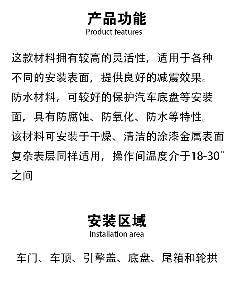 这款材料拥有较高的灵活性, 适用于各种不同的安装表面,提供良好的减振效果。这款也是防水材料,可较好地保护汽车底盘等安装面,具有防腐蚀,防氧化,防水等特性,该材料可安装于干燥、清洁的涂漆金属表面,复杂表层同样适用。操作间温度介于18-30°C之间。